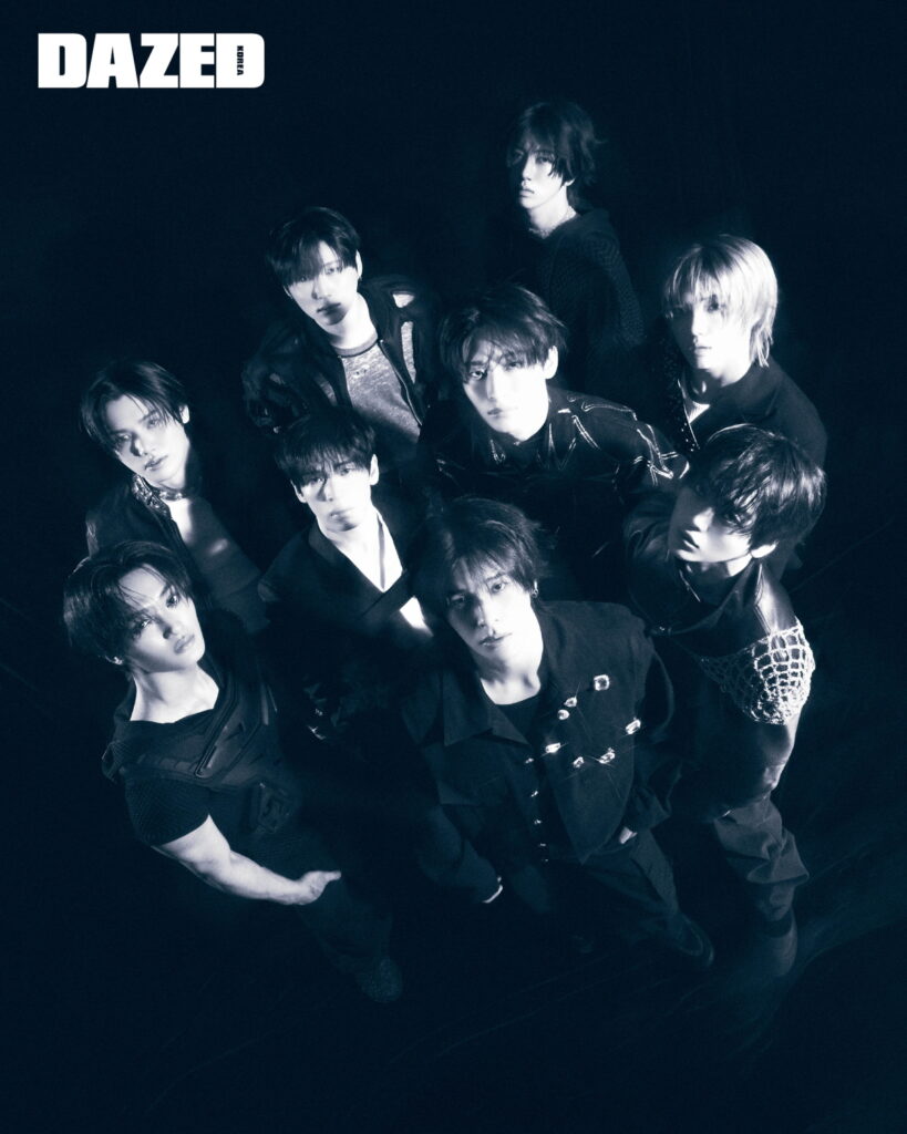 One standout moment from the shoot is a group portrait where CRAVITY seizes the spotlight with just their eyes. Their piercing gazes and effortless poise embody what DAZED described as a perfect harmony of trendiness and identity. Even without color, the group’s presence jumps off the frame.
