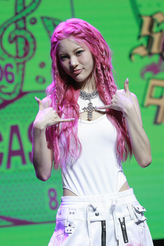 During the photo session at the MMF (Media Mini Festival), Gianna wowed the press with her confident stage presence and trend-savvy visuals. Dressed in edgy Y2K-inspired fashion, she gave off a mix of fierce determination and youthful charm. Her vibe? Somewhere between Gen Z rebel and K-pop fairy—it works.