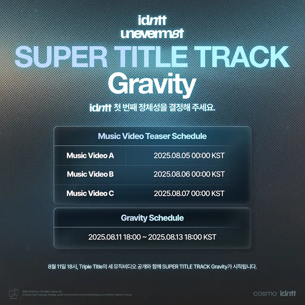 The group’s label, Modehouse, introduced a global fan voting project named Gravity on idntt’s official social media channels at midnight on June 30. The twist? Fans won’t just be picking a favorite—they’ll be selecting the centerpiece of the group’s debut, deciding which of the triple title tracks from their upcoming album unevermet will be crowned as the “super title track.”