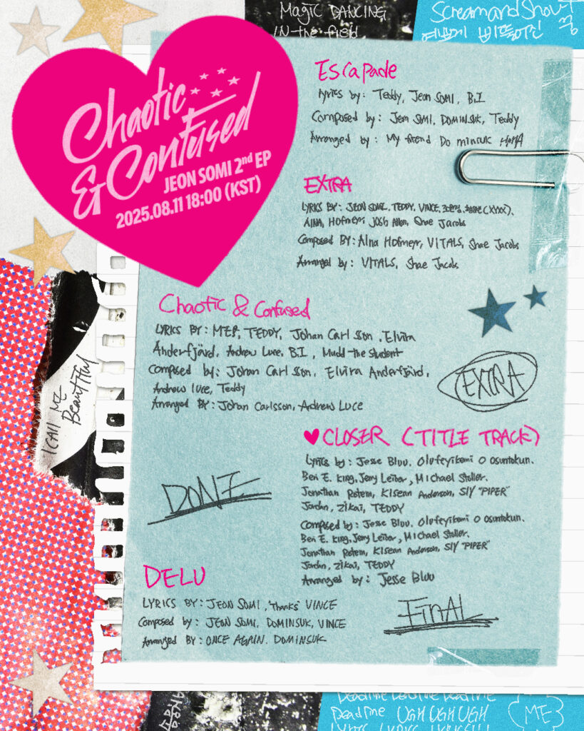 Mark your calendars: August 11 at 6PM KST. That’s when Jeon Somi makes her long-awaited comeback with her second EP, Chaotic & Confused, led by the title track ‘CLOSER.’ Kicking off the hype, her label, The Black Label, unveiled the full tracklist online—giving fans a peek into what’s shaping up to be her most personal album yet.