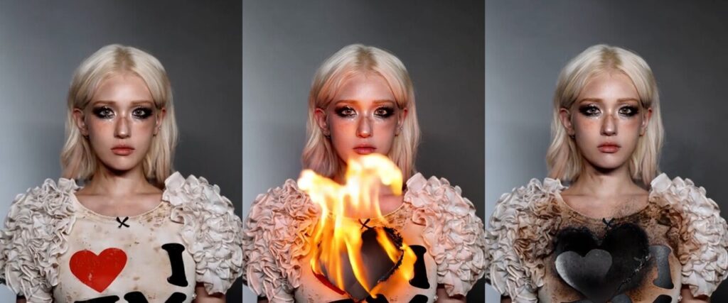 The 6-second motion teaser captures a haunting image of Somi in complete disarray—her smudged eye makeup, disheveled clothes, and vacant stare create a stark contrast to her usually bubbly style. In a surreal moment, flames erupt from her chest and black ashes in the shape of a heart fall around her, symbolizing a heart burned out. The cryptic visual suggests she’s shedding her signature ‘teen queen’ image for something far more intense.